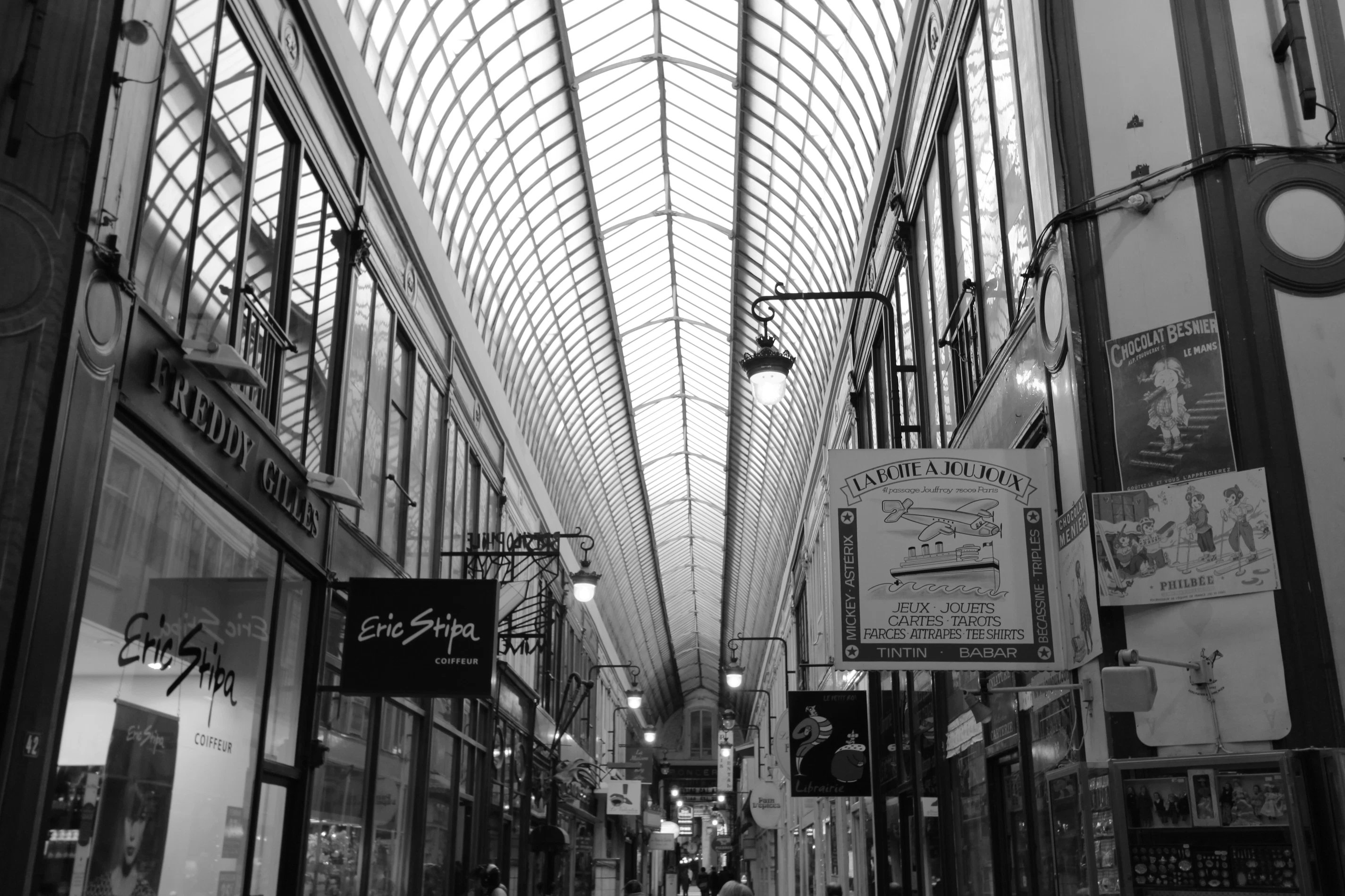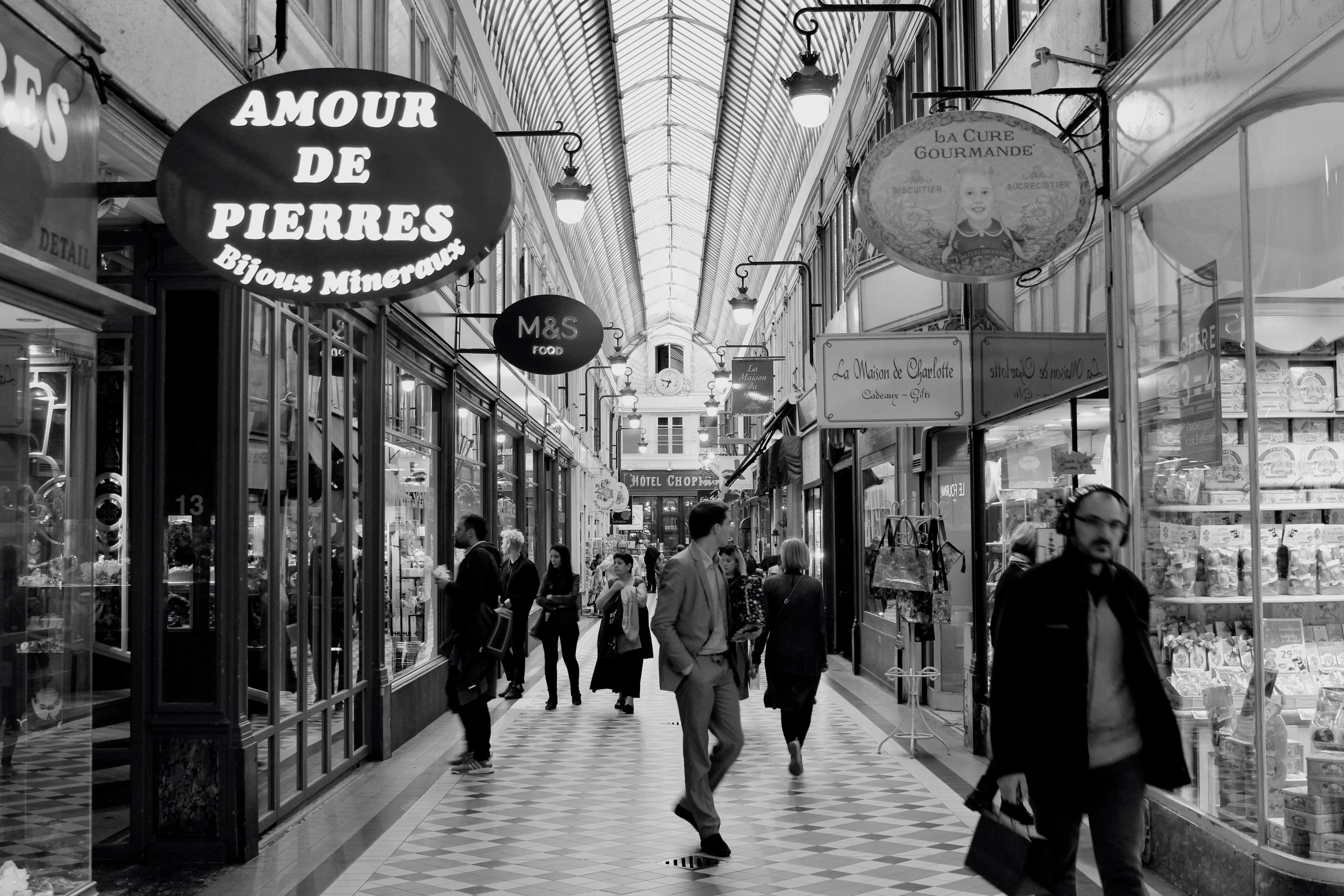 Le passage Jouffroy est sans doute l’un des plus emblématiques, inauguré en 1846 par le comte Felix de Jouffroy-Gonsans, l’ancêtre des propriétaires actuels du passage, il doit sa renommée au Musée Grévin qui s’y installa en 1882. Le Passage Jouffroy est à l’époque l’un des plus modernes, il disposait même d’un système de chauffage par le sol, pour permettre aux promeneurs de faire du lèche vitrine au chaud. Il est en fait l’ancêtre des centres commerciaux !